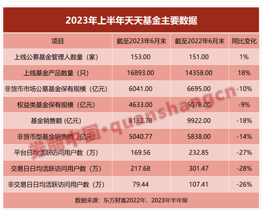 报告期末,天天基金非货币市场公募基金保有规模为6041亿元,权益类基金保有规模4633亿元,同比分别下滑10%和9%。