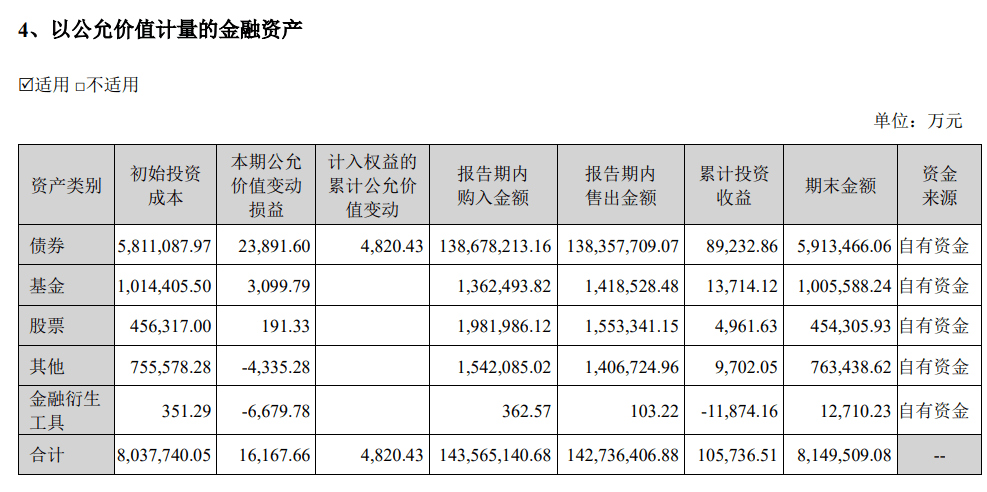 此外,公司今年上半年以公允价值计量的金融资产实现盈利,累计投资收益达到10.57亿元,而初始投资成本为80.37亿元,投资收益率为13.15%。