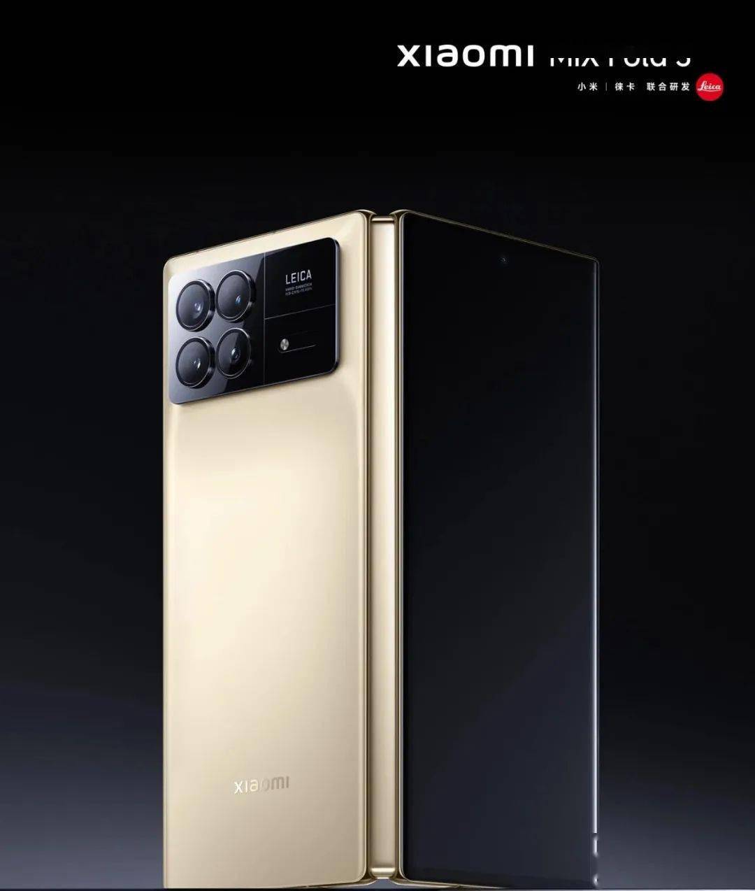 从海报上可以看到,小米 MIX Fold 3 折叠屏提供 黑色、 金色两款配色,暂未公布配色名称。小米 MIX Fold 3 搭载 矩形相机模组,左侧为后置四摄,右侧印有 徕卡标志性 logo,边框采用平直设计,与机身背面连接处有一定弧度。