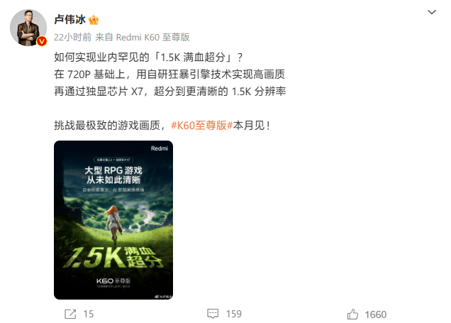 另外 K60 还搭载了一个“满血超分”的技术,卢伟冰是这样解释的:在 720P 基础上,用自研狂暴引擎技术实现高画质,再通过独显芯片 X7,超分到更清晰的 1.5K 分辨率。