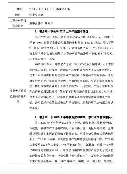 新洋丰向投资者介绍了公司2023上半年的基本情况。2023年上半年公司实现营业收入804,924.32万元,同比下降16.30%;归属于上市公司股东的净利润68,980.21万元,同比下降25.01%。截至2023年6月30日,公司总资产为1,576,050.76万元,较上年末减少6.41%;归属于上市公司股东的净资产901,390.76万元,较上年末增长5.02%。