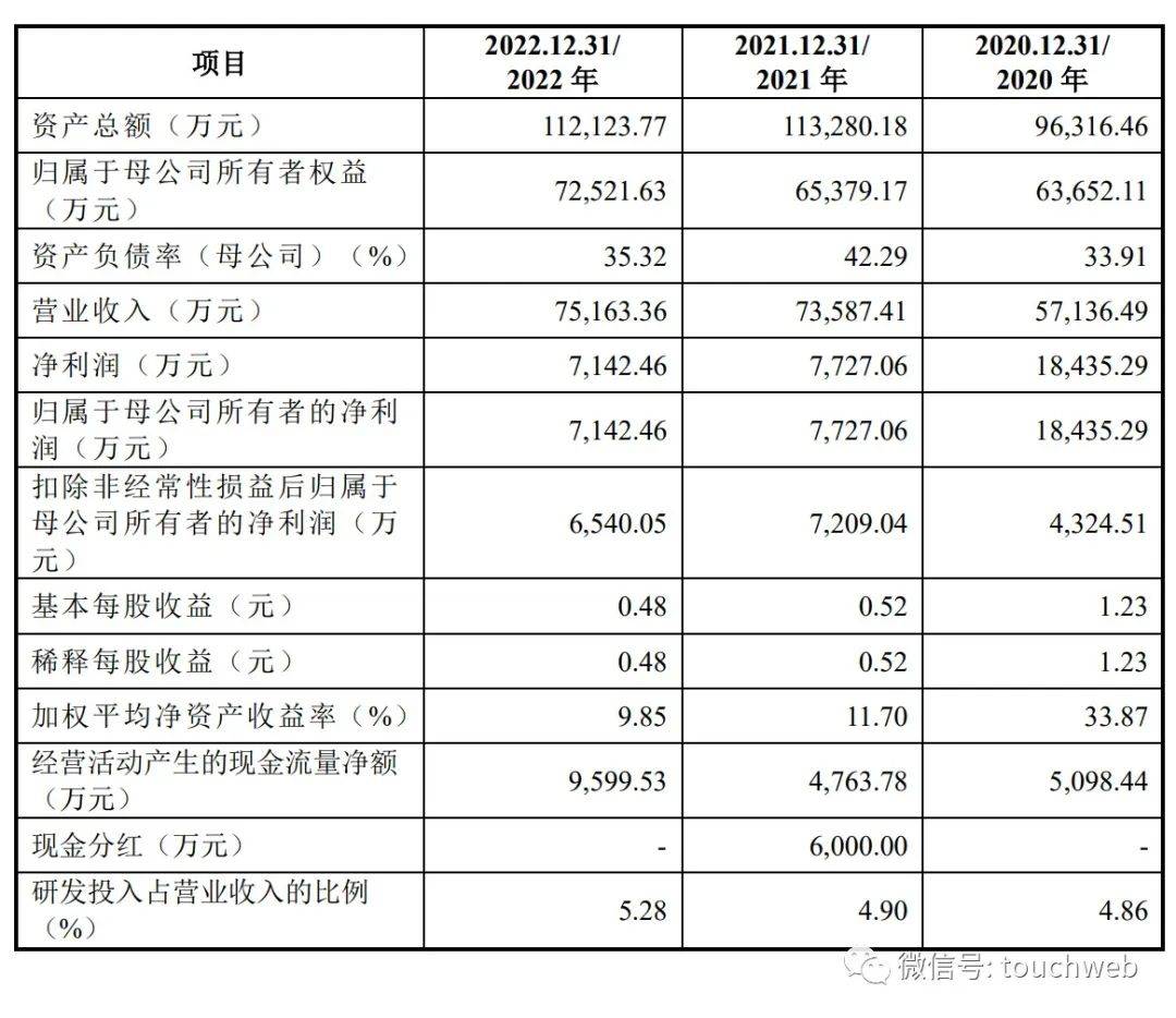 招股书显示,蓝箭电子2020年、2021年、2022年营收分别为5.71亿元、7.36亿元、7.52亿元;净利分别为1.84亿元、7727万元、7142.46万元;扣非后净利分别为4324.5万元、7209万元、6540万元。