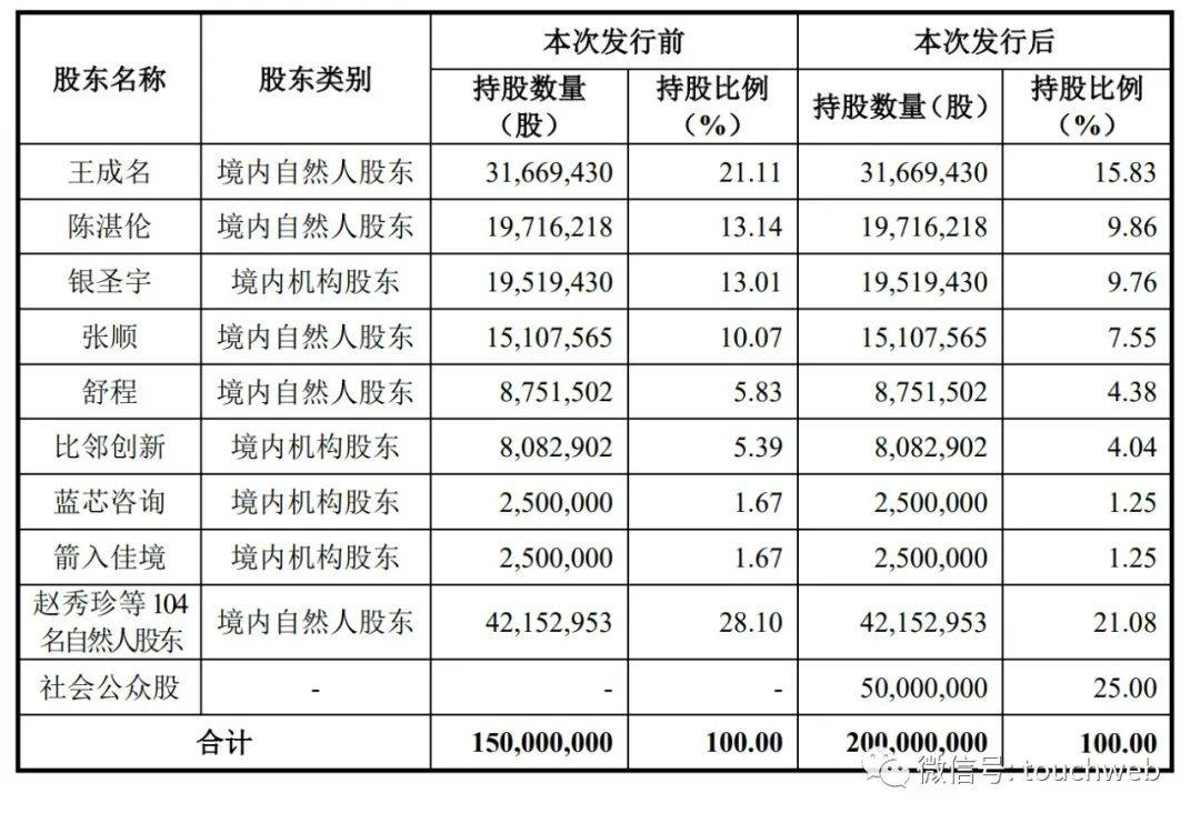 IPO后,王成名持股为15.83%,陈湛伦持股为9.86%,银圣宇持股为9.76%,张顺持股为7.55%,舒程持股为4.38%,比邻创新持股为4.04%,蓝芯咨询、箭入佳境分别持股为1.25%。