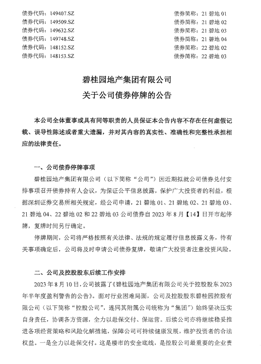 【大河财立方消息】碧桂园地产集团有限公司8月12日晚间公告,因近期拟就公司债券兑付安排事项召开债券持有人会议,根据相关规定,经公司申请,16腾越02、19碧地03、20碧地03、20碧地04、21碧地01、21碧地02、21碧地03、21碧地04、22碧地02和22碧地03公司债券自2023年8月14日开市起停牌,复牌时间另行确定。集团将与各持份者沟通,并考虑采取各种债务管理措施,维护投资者的合法权益。后续集团亦将继续稳妥推进各项风险化解措施和经营策略,以保障集团的未来长远发展。控股公司成立了由董事会主席任组长的专项工作小组,建立工作机制,统筹协调、高效决策、有力推进,努力渡过难关。