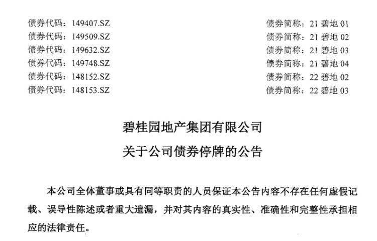 据深交所、上交所8月12日晚间公告,碧桂园(02007.HK)地产集团有限公司8月12日晚间发布债券公告,因近期拟就公司债券兑付安排事项召开债券持有人会议,根据深圳证券交易所相关规定,经公司申请,11只公司债券自2023年8月14日开市起停牌,复牌时间另行确定。