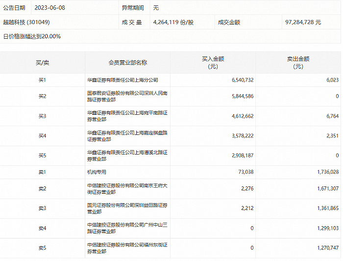 6月8日,超越科技今日涨停,龙虎榜数据显示,上榜营业部席位全天成交3091.61万元,占当日总成交金额比例为31.78%。其中,买入金额为2356.19万元,卖出金额为735.42万元,合计净买入1620.77万元。