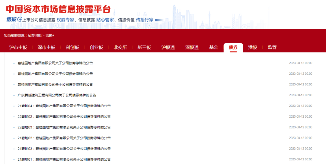 8月12日,碧桂园宣布对旗下多只境内公司债券自2023年8月14日开市起停牌,复牌时间另行确定。