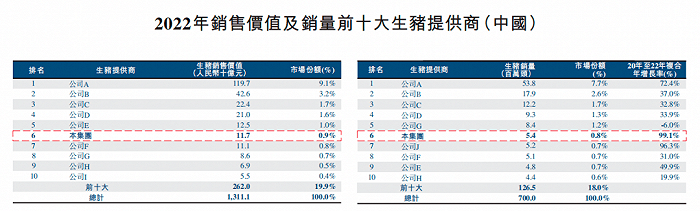 2022年,德康农牧的生猪销售价值为117亿元,市场份额为0.9%;公司的生猪销量为540万头,市场份额为0.8%,德康农牧在生猪销售价值和销量两方面均排名第六。