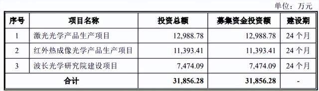 按照发行计划,波长光电原募集资金3.18亿元,拟用于激光光学产品生产项目、红外热成像光学产品生产项目和波长光学研究院建设项目。