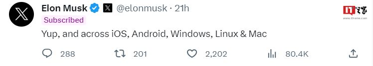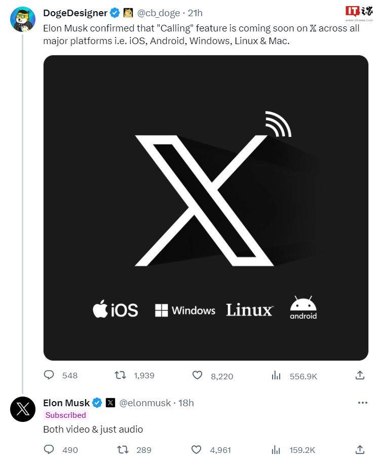 8 月 12 日消息,马斯克表示,X(推特)将全平台推出“通话”功能,支持视频 / 语音通话,涵盖安卓、iOS、Windows、Linux 和 Mac 平台。
