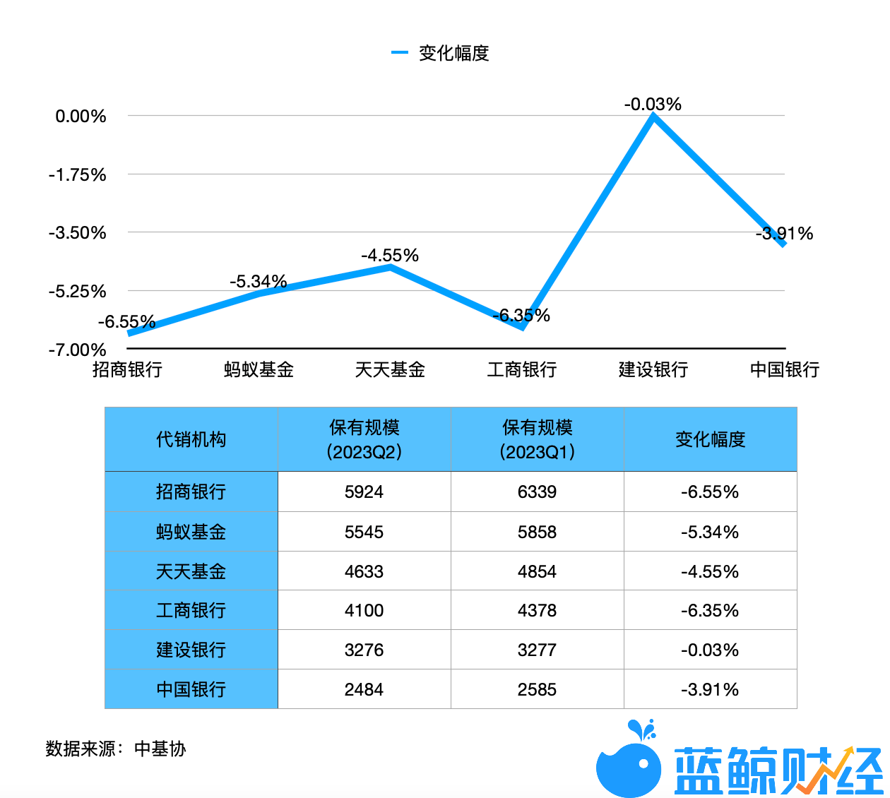 蓝鲸财经发现,不仅是天天基金,招商银行、蚂蚁基金、工商银行等头部代销机构在今年二季度也都有不同幅度的缩水。中基协披露的信息显示,招商银行作为股票+混合公募基金保有规模最大的代销机构,一季度保有规模为 6339 亿,二季度降低到 5924 亿,环比减少 6.55%。除此,蚂蚁基金环比减少 5.34%。