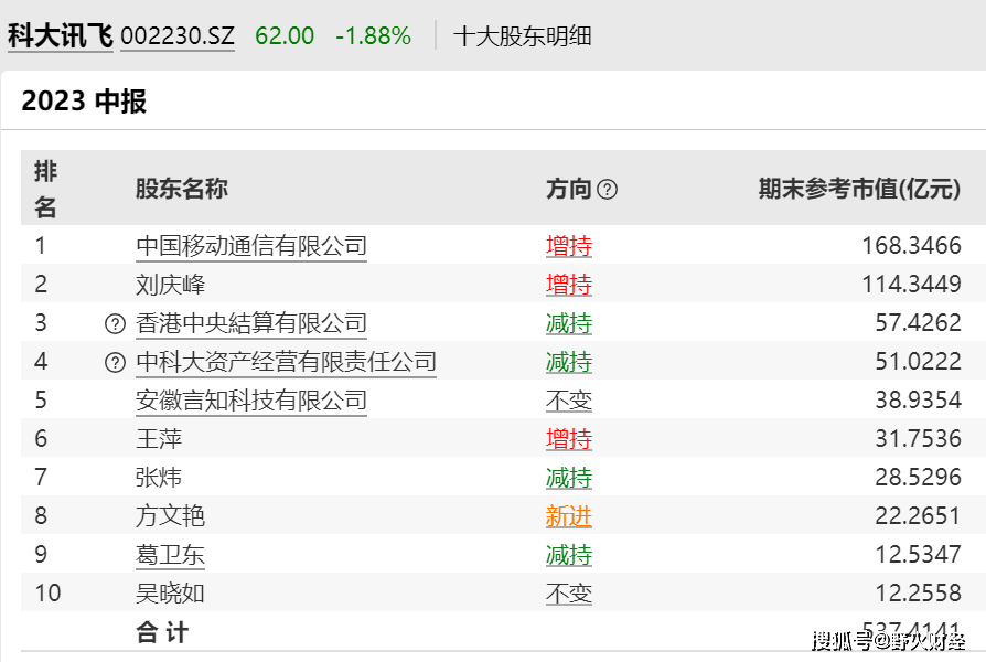 股价大起大落之际,前十大股东持股比例也出现变化。科大讯飞也是千亿市值公司前十大股东中出现较多自然人股东的公司之一。