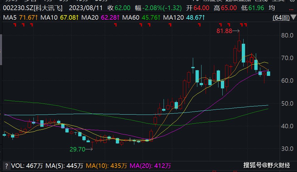 AI相关概念在上半年被二级市场热炒一波,科大讯飞作为龙头之一,股价曾从30多元涨到80多元,但从6月下旬就开始回调,最新股价为62元,和年初相比仍有1倍左右涨幅,和高点相比则回撤大约1/4。