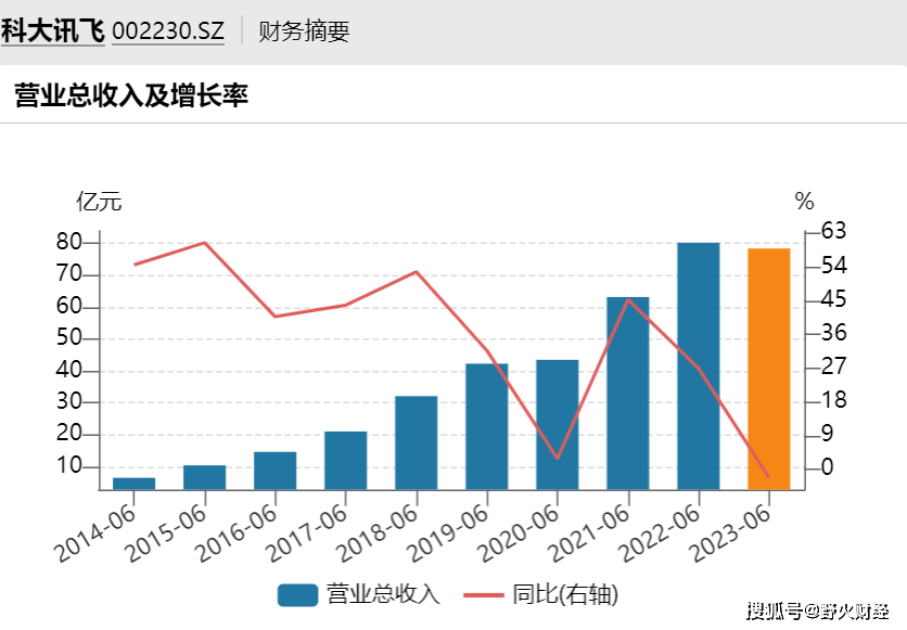 先看科大讯飞(002230)2023年中期业绩,上半年营业收入78.42亿元,同比下降2.3%;净利润7357万元,同比下降约74%,双双下滑。这是最近10年(2014年至2023年)科大讯飞中期营收首次下滑。