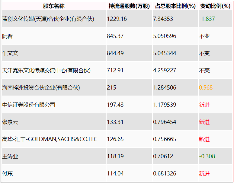 半年报显示,2023年上半年末的公司十大流通股东中,新进股东为中信证券股份有限公司、张素云、高华-汇丰-GOLDMAN,SACHS&CO.LLC、付东,取代了一季度末的王暨钟、广发科技创新混合型证券投资基金、林涛、徐刚。在具体持股比例上,海南梓洲投资合伙企业(有限合伙)持股有所上升,蓝创文化传媒(天津)合伙企业(有限合伙)、王涛亚持股有所下降。