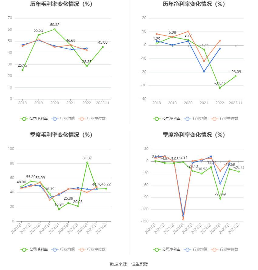 2023年上半年,公司毛利率为45.00%,同比上升23.79个百分点;净利率为-23.09%,较上年同期上升4.47个百分点。从单季度指标来看,2023年第二季度公司毛利率为45.22%,同比上升19.83个百分点,环比上升0.46个百分点;净利率为-26.13%,较上年同期上升4.79个百分点,较上一季度下降6.44个百分点。