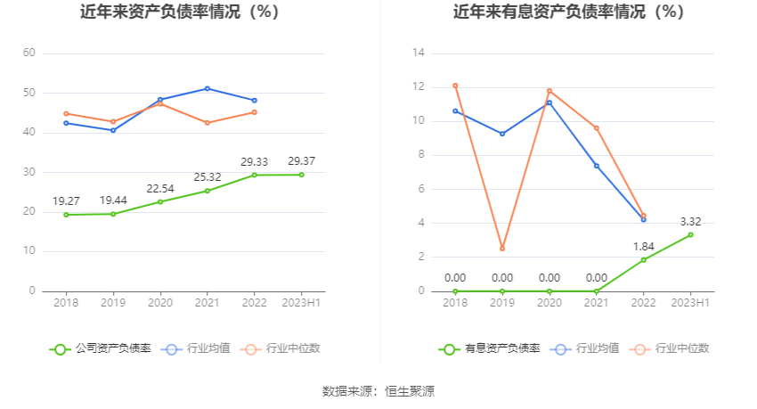 偿债能力方面,公司2023年二季度末资产负债率为29.37%,相比上年末增加0.04个百分点;有息资产负债率为3.32%,相比上年末增加1.48个百分点。