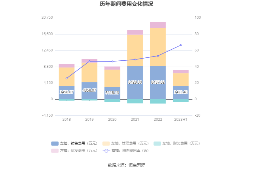 2023年上半年,公司期间费用为6792.72万元,较上年同期减少1504.52万元;但期间费用率为66.44%,较上年同期上升25.14个百分点。其中,销售费用同比下降16.93%,管理费用同比下降13.87%,研发费用同比下降15.74%,财务费用由去年同期的-499.67万元变为-640.16万元。