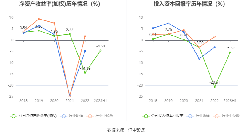 数据显示,2023年上半年公司加权平均净资产收益率为-4.50%,较上年同期增长3.49个百分点;公司2023年上半年投入资本回报率为-5.32%,较上年同期增长5.17个百分点。