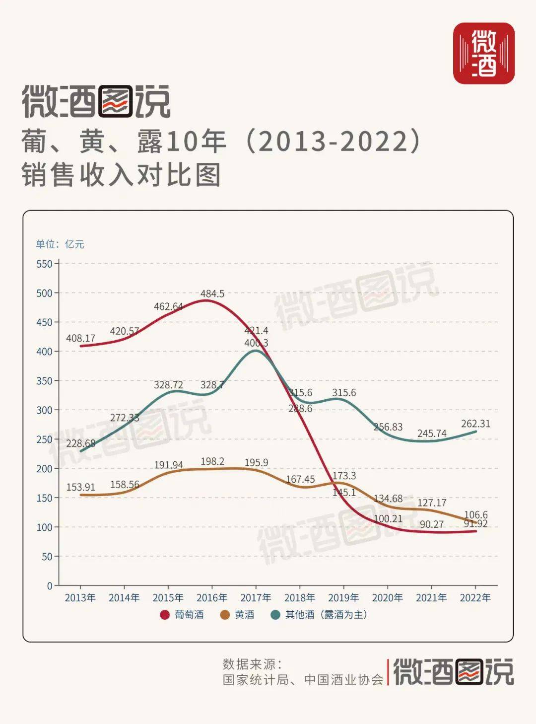 微酒通过复盘过去10年(2013-2022)的“第三酒种”的变化,梳理出了葡萄酒、黄酒、露酒产业沉浮背后的部分逻辑。
