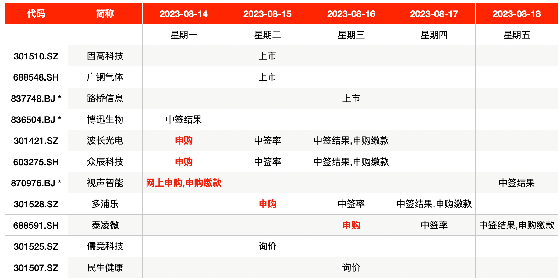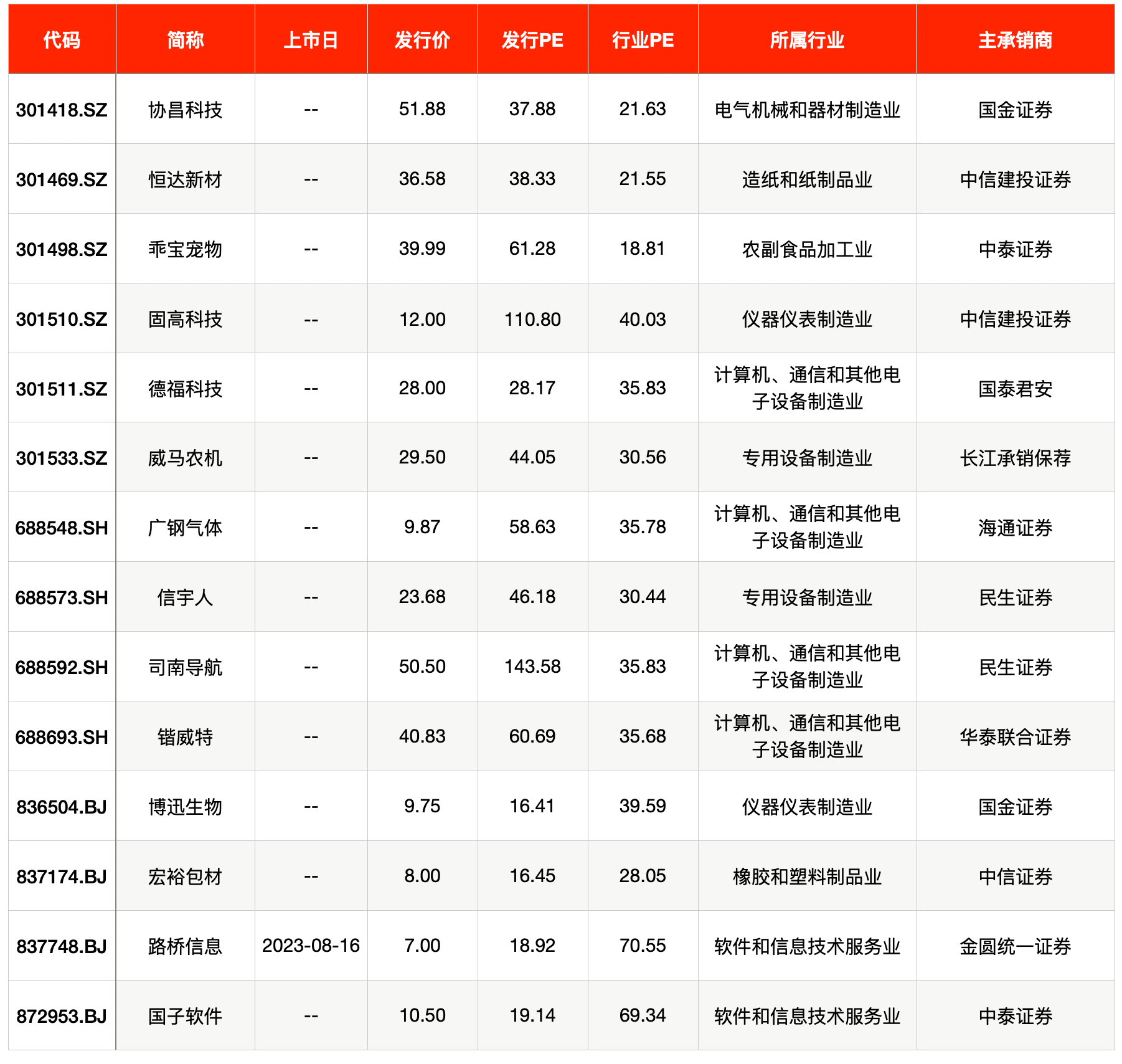 截至8月13日,A股共有3只股票已公布上市计划,固高科技股份有限公司(简称“固高科技”,301510.SZ)、广州广钢气体能源股份有限公司(简称“广钢气体”,688548.SH)将于本周二(8月15日)上市,厦门路桥信息股份有限公司(简称“路桥信息”,837748.BJ)将于本周三(8月16日)上市。