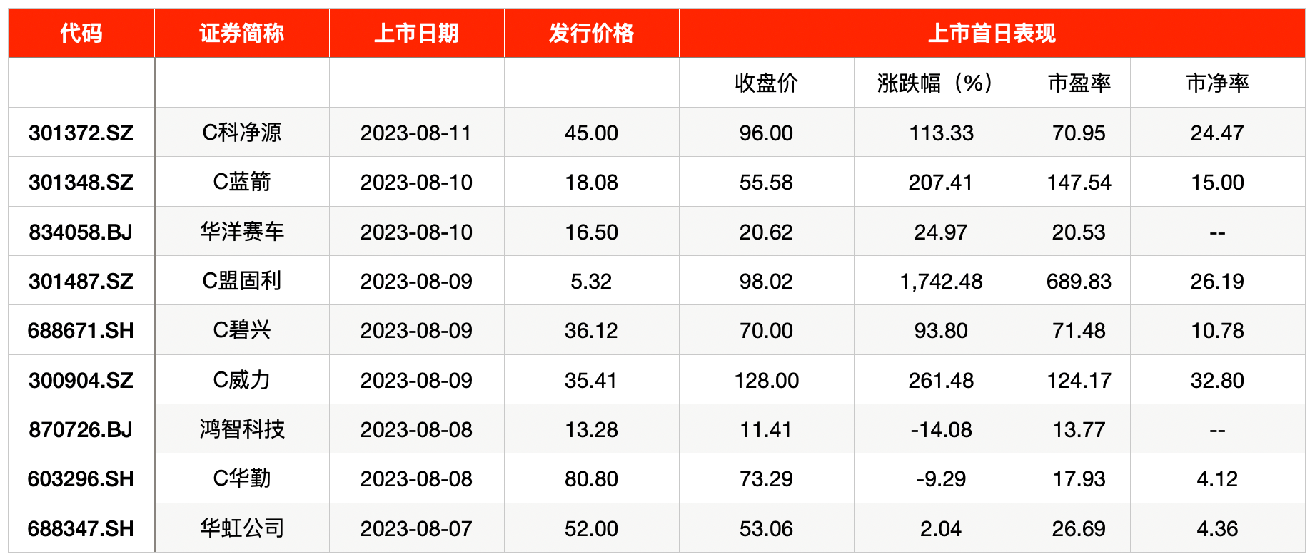 上周共有9只新股上市,分别为华虹半导体有限公司(简称“华虹公司”,688347.SH)、华勤技术股份有限公司(简称“华勤技术”,603296.SH)、广东鸿智智能科技股份有限公司(简称“鸿智科技”,870726.BJ)、天津国安盟固利新材料科技股份有限公司(简称“盟固利”,301487.SZ)、佛山市蓝箭电子股份有限公司(简称“蓝箭电子”,301348.SZ)、银川威力传动技术股份有限公司(简称“威力传动”,300904.SZ)、北京科净源科技股份有限公司(简称“科净源”,301372.SZ)、碧兴物联科技(深圳)股份有限公司(简称“碧兴物联”,688671.SH)、浙江华洋赛车股份有限公司(简称“华洋赛车”,834058.BJ)。