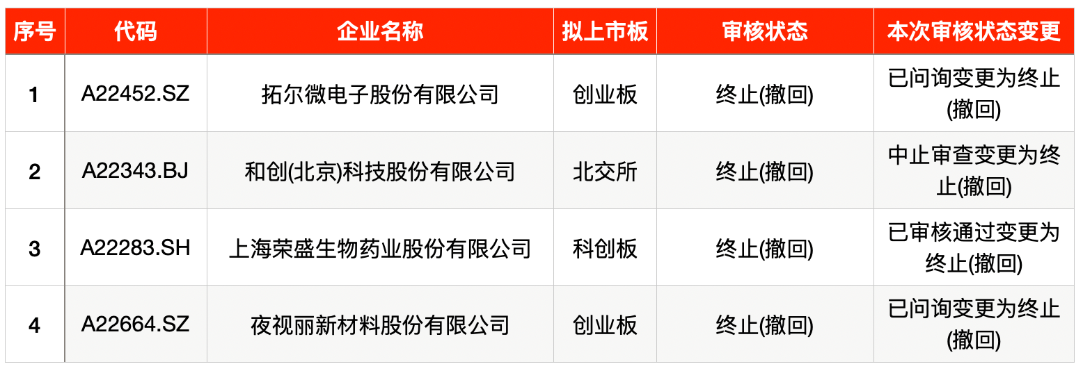 上周共有4家企业终止IPO,均为主动撤回IPO材料。