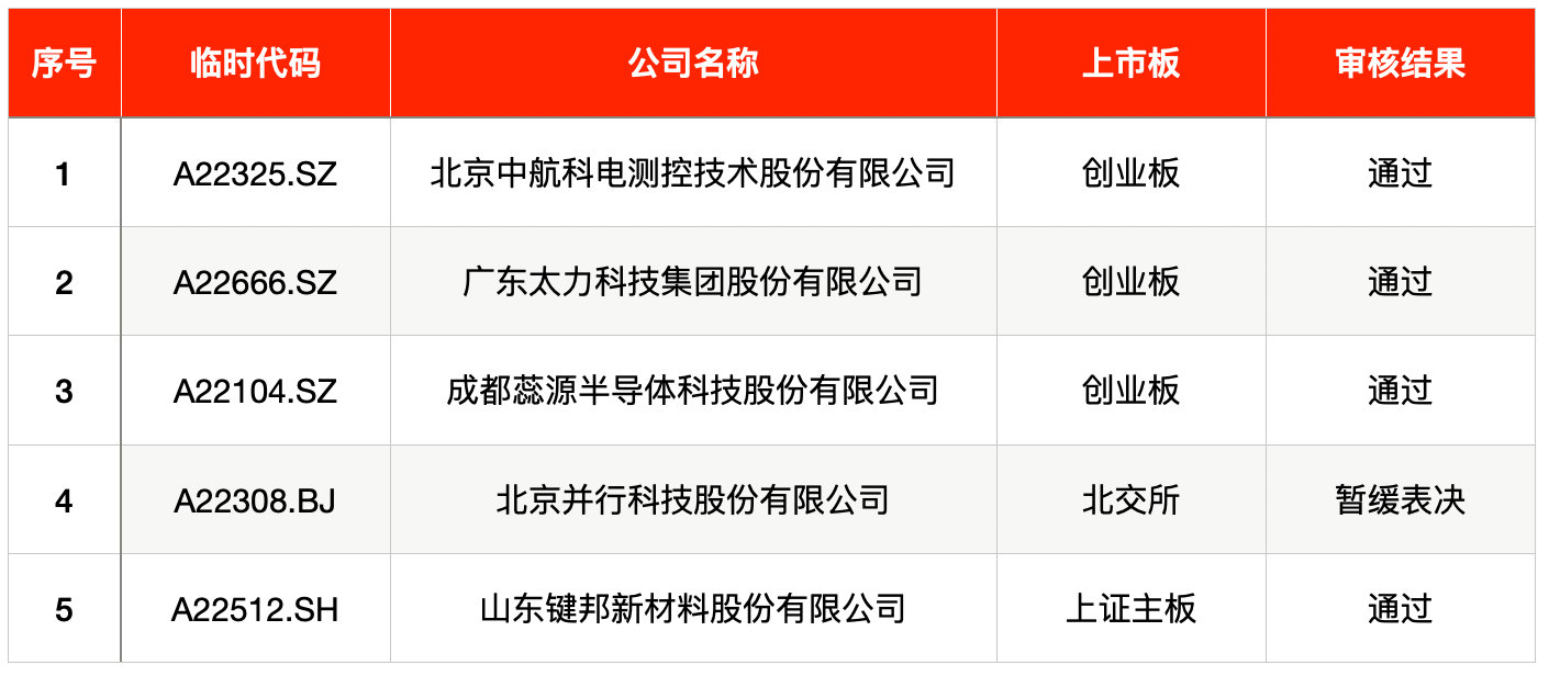 发审委审核方面,上周共有5家企业首发过会,4家企业获得通过,1家企业暂缓表决。