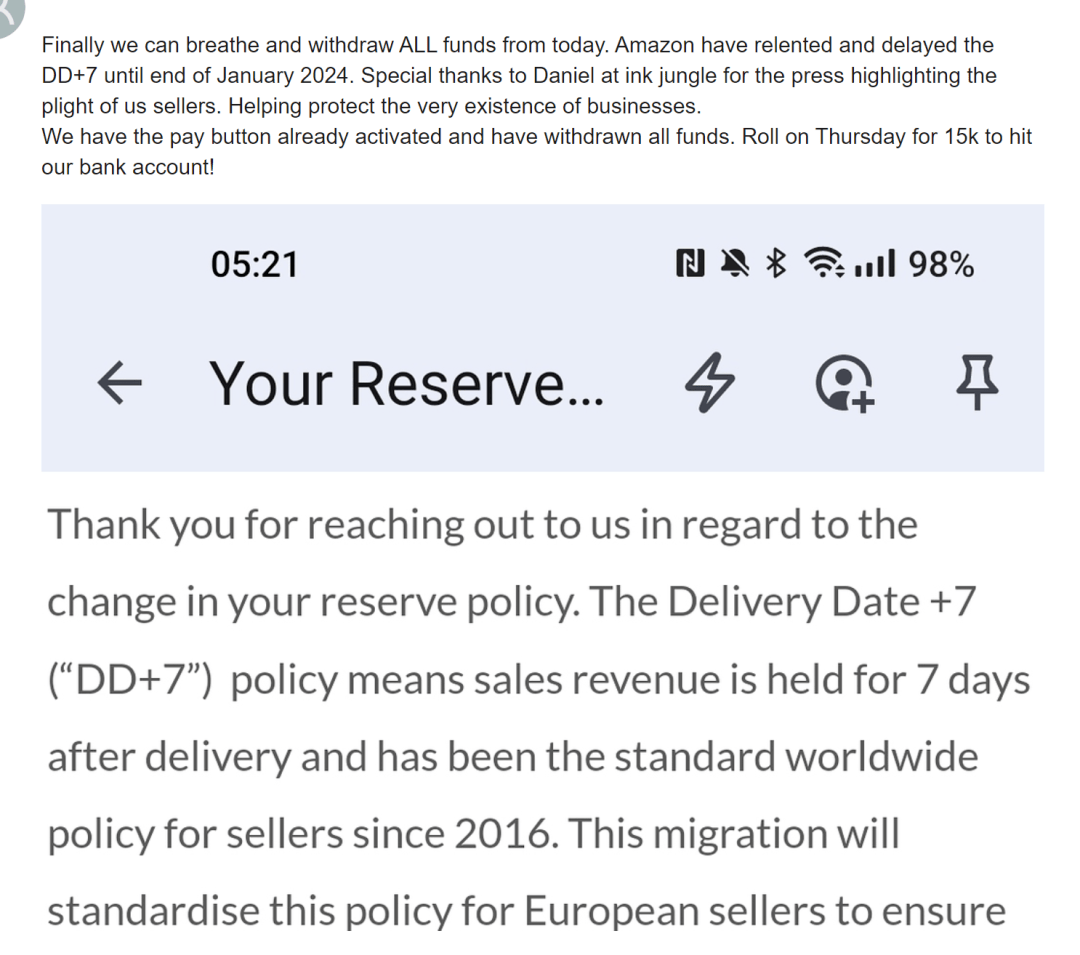 AMZ123曾在《亚马逊又一政策变动,大批卖家:要破产了?》文章中提及,近日数百名亚马逊欧洲站卖家收到了亚马逊的通知:产品交付完成后放款时间将延迟至7天以上,以确保充足的后备资金用于退货或客户索赔。