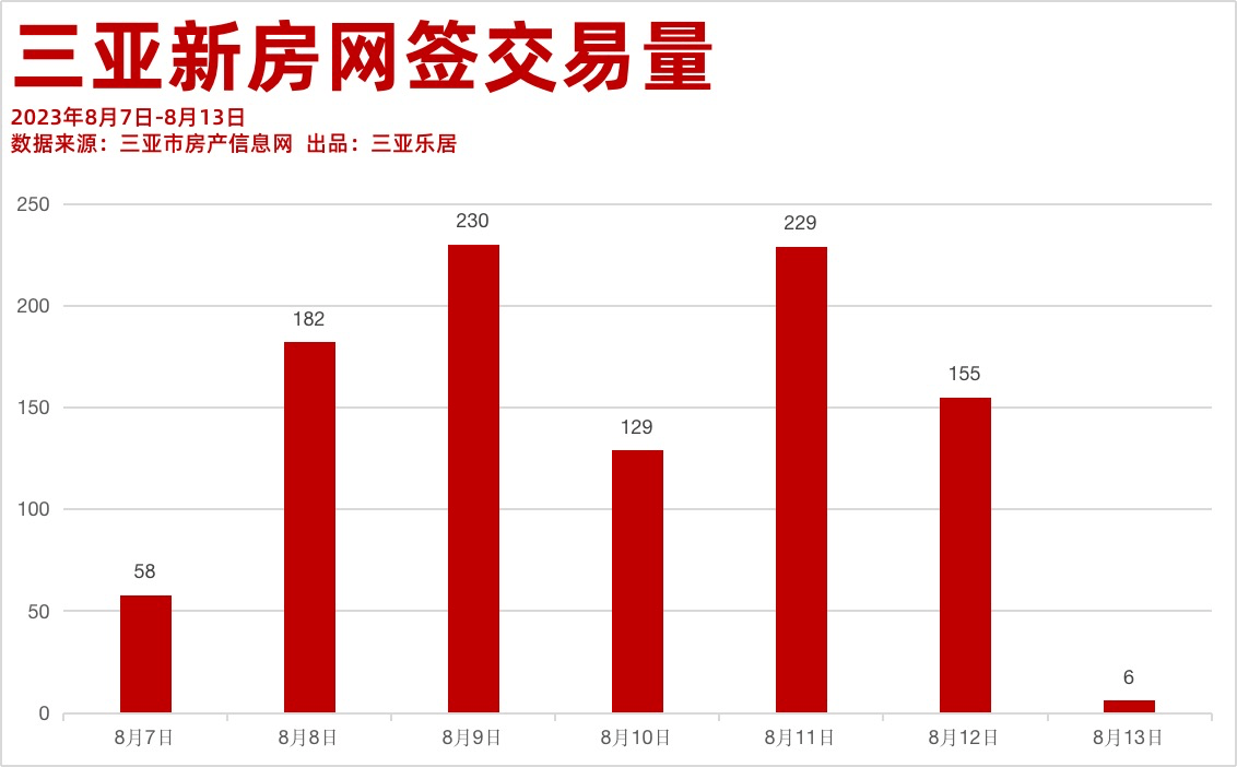 据三亚房产信息网数据显示,2023年8月第2周(8.7-8.13)三亚新房网签交易量共计989套,对比前一周期的870套成交,8月第2周环比上升13.67%,当周最高日成交在周三(8月9日)230套, 最低日交易量为6套。