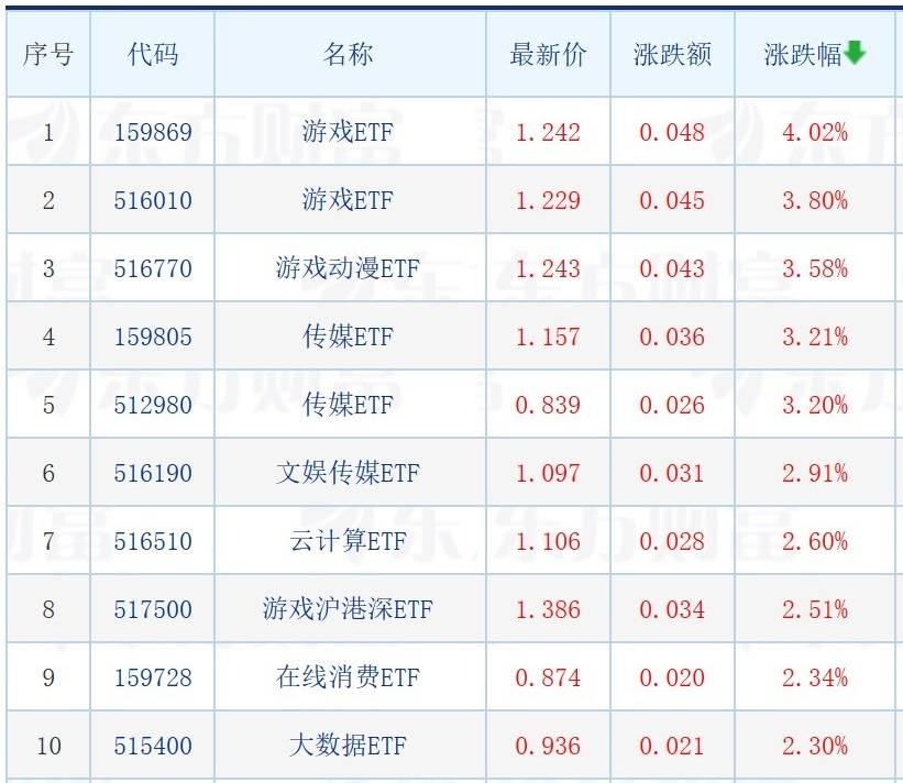 ETF方面,游戏、传媒相关ETF大涨超3%,云计算、大数据相关ETF涨逾2%。