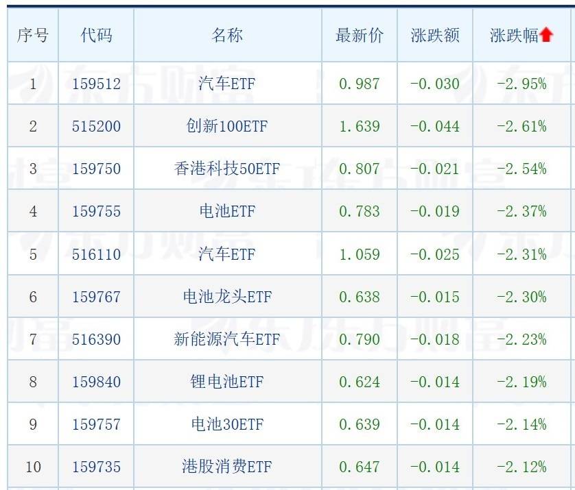 下跌方面,汽车、电池等相关ETF跌超2%。