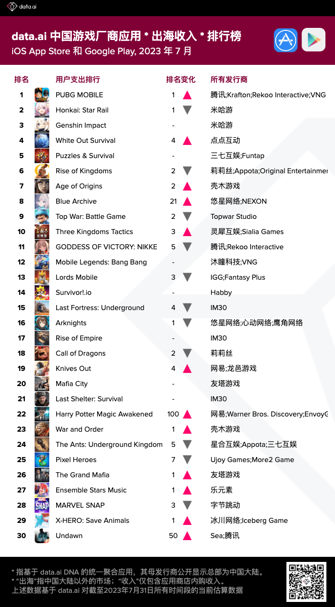 data.ai发布了2023年7月中国游戏厂商及应用出海收入30强榜单,以下是详细内容: