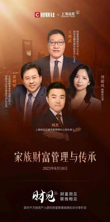 《财见》第一期将邀请到三位行业大咖就“家族财富管理与传承”这一主题进行深度探讨,三位对话嘉宾分别是国家金融发展实验室中心主任、财富管理研究中心主任王增武先生,上海国际信托信睿家族管理办公室负责人刘杰先生以及大成律师事务所高级合伙人、家族办公室法律研究中心主任黄利军先生。更多深度洞见将一一呈现,敬请期待!