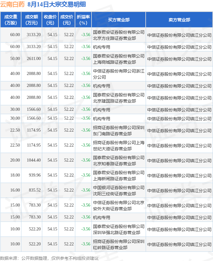 截至2023年8月14日收盘,云南白药(000538)报收于54.15元,下跌0.46%,换手率0.53%,成交量9.47万手,成交额5.13亿元。