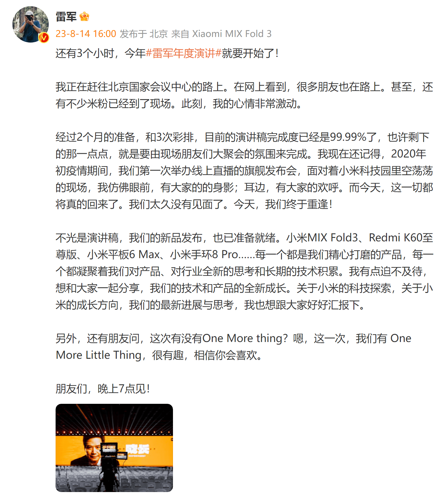 经过2个月的准备,和3次彩排,目前的演讲稿完成度已经是99.99%了,也许剩下的那一点点,就是要由现场朋友们大聚会的氛围来完成。我现在还记得,2020年初疫情期间,我们第一次举办线上直播的旗舰发布会,面对着小米科技园里空荡荡的现场,我仿佛眼前,有大家的的身影;耳边,有大家的欢呼。而今天,这一切都将真的回来了。我们太久没有见面了。今天,我们终于重逢!