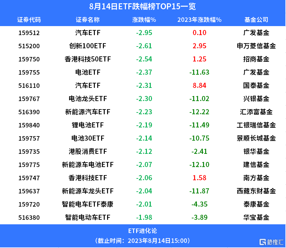 ETF方面,新能源赛道股全线下挫,汽车板块领跌。汽车ETF、创新100ETF分别跌2.95%、2.61%。电池板块跟随下挫,电池ETF、电池龙头ETF分别跌2.37%、2.3%。上周五中概股全军覆没,香港科技50ETF跌2.54%,中概互联ETF跌1.94%。