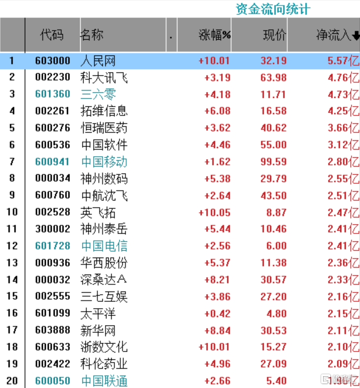 资金流向来看,主力资金大幅净流入AI概念股,其中科大讯飞和三六零均有超4亿资金流入。