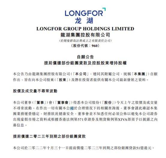 2022年11月1日,龙湖集团又在港交所公告,公司当日向银团贷款代理行发出提前偿还2023年到期的部分银团贷款34.5亿港元的不可撤销通知。就此提前还款通知待大多数参贷行同意之后,公司会即时履行还款。