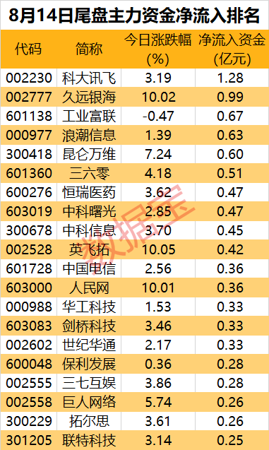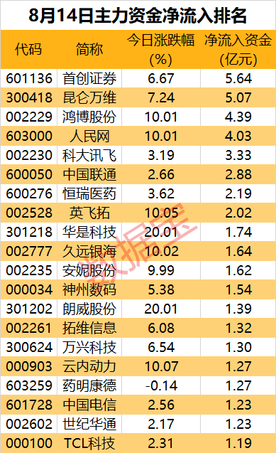 其后,昆仑万维、鸿博股份、人民网主力资金净流入金额居前,分别为5.07亿元、4.39亿元和4.03亿元,其中鸿博股份和人民网涨停。