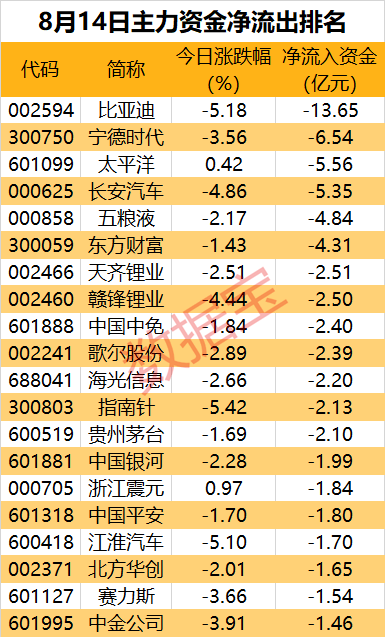 数据宝统计,34股遭主力资金净流出超1亿元。新能源车巨头比亚迪和动力电池龙头宁德时代均遭到主力大幅出逃,资金全天分别净流出13.65亿元、6.54亿元。