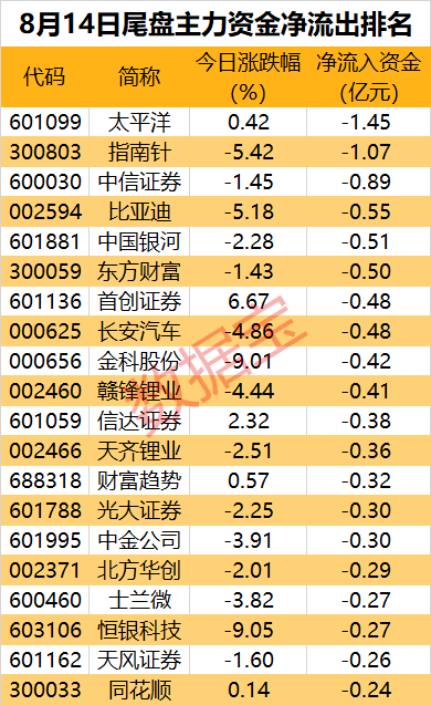 数据宝统计,10股尾盘主力资金净流出超4000万元。太平洋和指南针尾盘净流出金额居前,均超1亿元。
