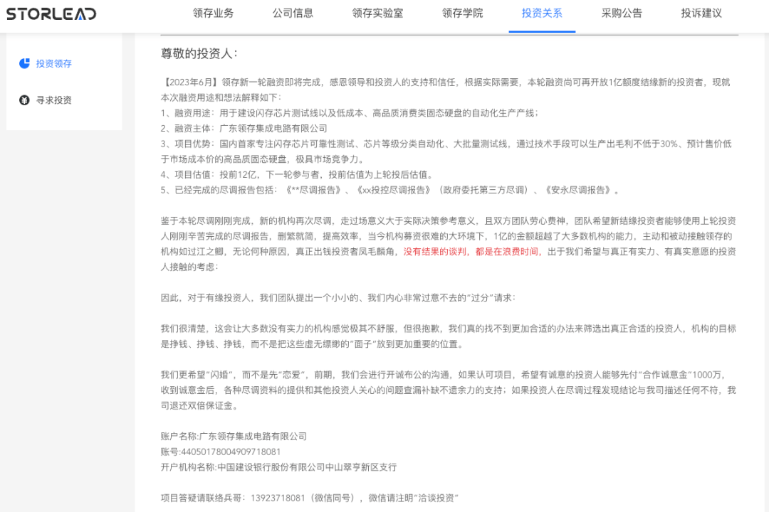 8月4日,领存技术官网「投资者关系」一栏中挂出的,1000万尽调“合作诚意金”声明,被投资圈内人截图,在群内快速传阅,外加上媒体的炒作,领存创始人楚一兵被推至舆论的风口浪尖,舆论的声音鲜明的分为两派。