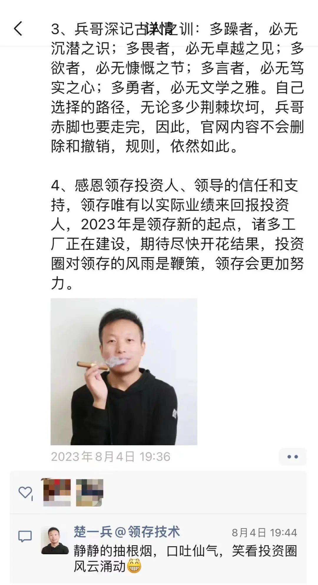 面对舆论,楚一兵没有退缩,他在朋友圈和官网回应一篇600字“小作文”,大致意思是:无意冒犯任何投资人,只是想提升融资效率,公司没有专门负责融资的人员,创始人的有效时间应该用于工厂建设和内部管理。并表示,官网内容不会删除和撤销,规则,依然如此。