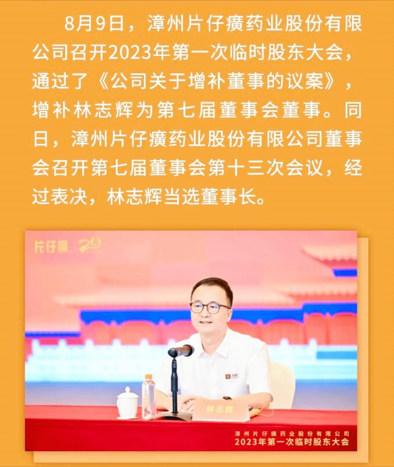2023年8月9日,漳州片仔药业股份有限公司召开2023年第一次临时股东大会,通过《公司关于增补董事的议案》,增补林志辉为第七届董事会董事。