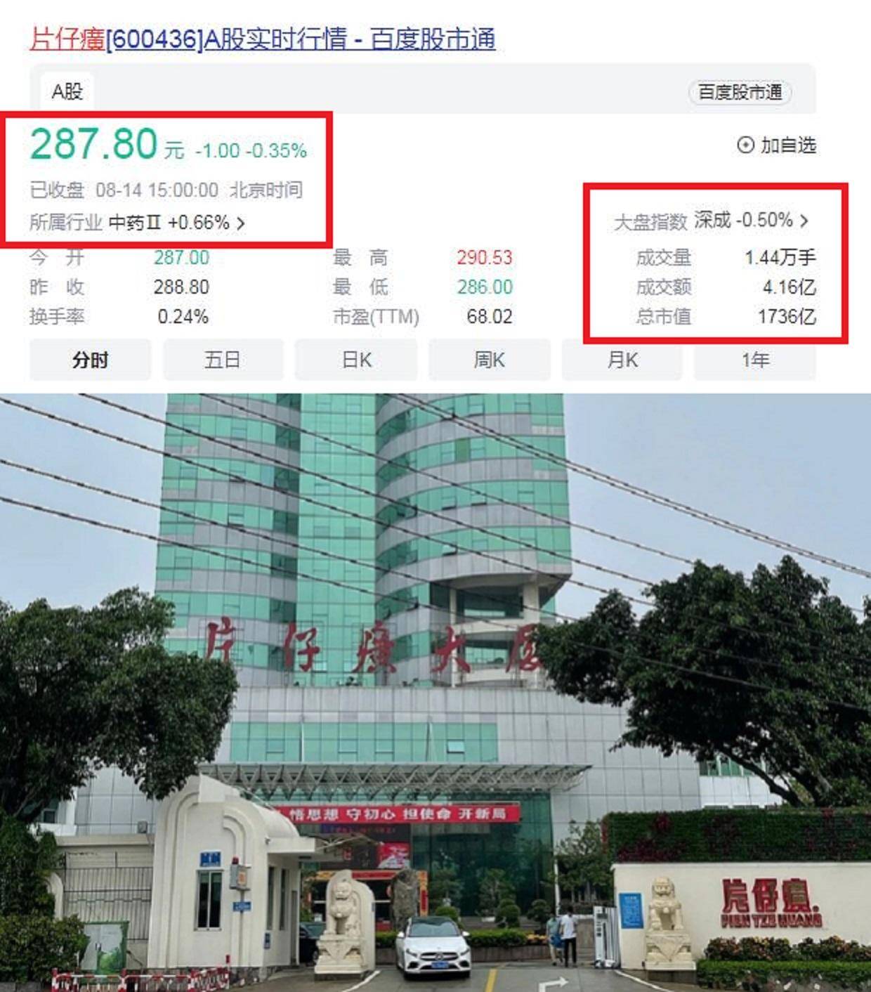 截止2023年8月14日,片仔癀的股票价格已经攀升至287.80元/股,总市值高达1736.35亿元人民币。