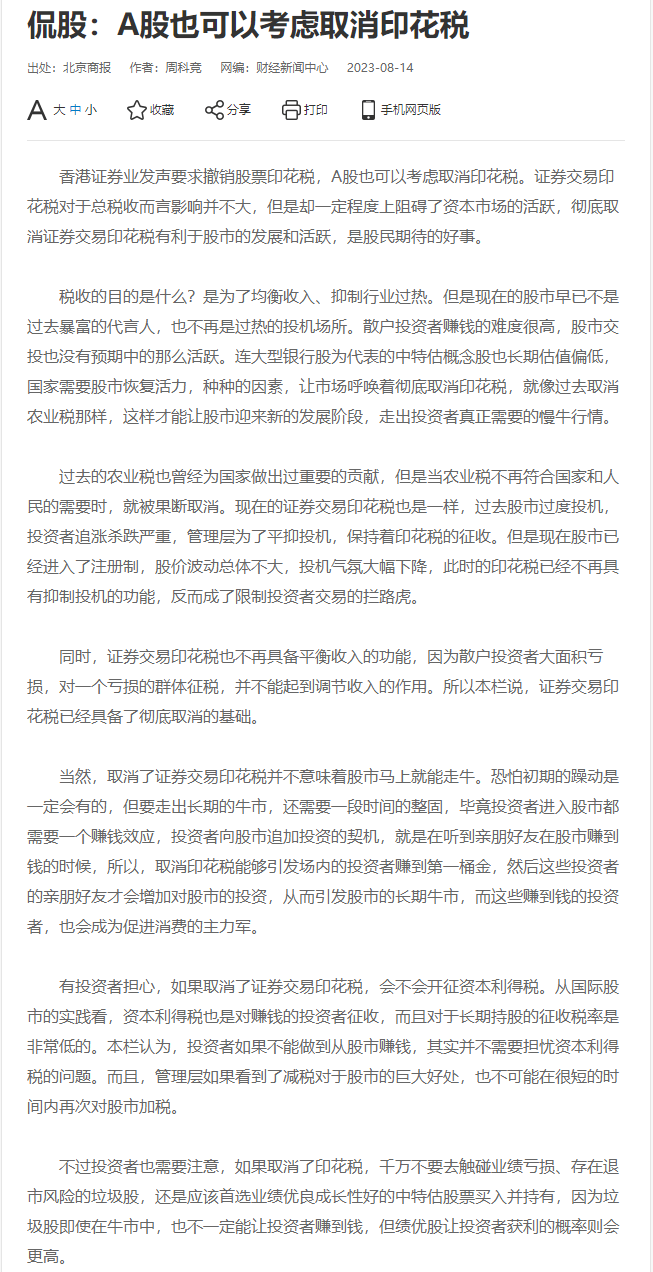 【北京商报评论:A股也可以考虑取消印花税】财联社8月14日电,北京商报评论文章称,香港证券业发声要求撤销股票印花税,A股也可以考虑取消印花税。证券交易印花税对于总税收而言影响并不大,但是却一定程度上阻碍了资本市场的活跃,彻底取消证券交易印花税有利于股市的发展和活跃,是股民期待的好事。同时,证券交易印花税也不再具备平衡收入的功能,因为散户投资者大面积亏损,对一个亏损的群体征税,并不能起到调节收入的作用。所以说,证券交易印花税已经具备了彻底取消的基础。取消印花税能够引发场内的投资者赚到第一桶金,然后这些投资者的亲朋好友才会增加对股市的投资,从而引发股市的长期牛市,而这些赚到钱的投资者,也会成为促进消费的主力军。