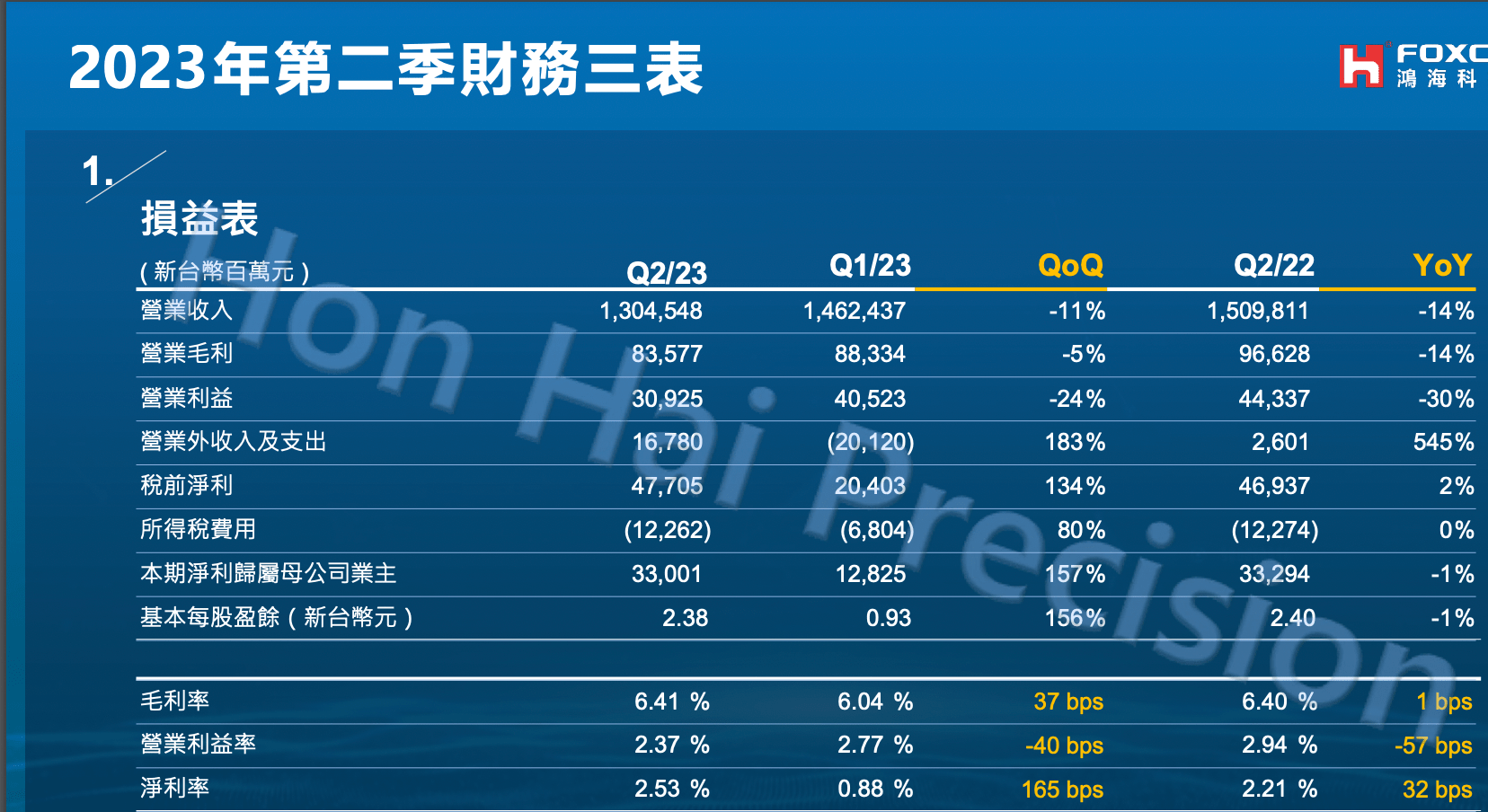 8月14日,富士康母公司鸿海精密工业股份有限公司(鸿海,2317.TW)公布第二季度经营业绩并举办法人说明会。业绩数据显示,鸿海第二季度营收1.3万亿元新台币(下同,约合2976.9亿元人民币),同比下滑约14%,市场预估1.34万亿元;净利润330亿元(约合75亿元人民币),同比下降1%,市场预估259.3亿元;EPS(每股收益)2.38元,去年同期为2.40元。