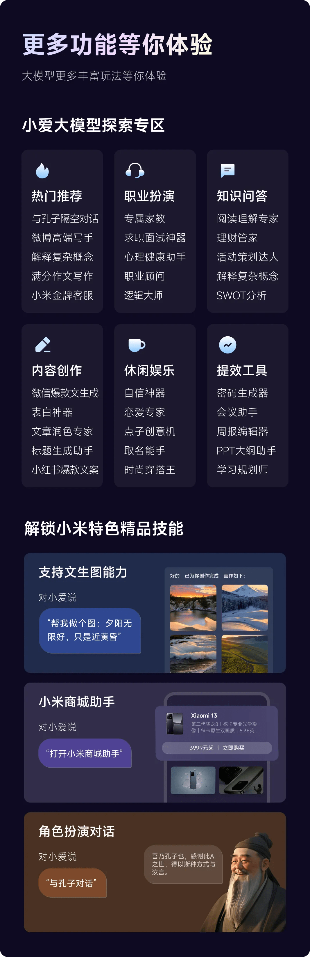 如今的她,拥有一个更加强大的大脑,可以为你答疑解惑、激发灵感、创造艺术,还能扮演角色进行自然对话。结合大模型的对话特点升级了小爱的交互模型,同时让小爱同学原有的丰富能力与大模型的强大通识能力结合。