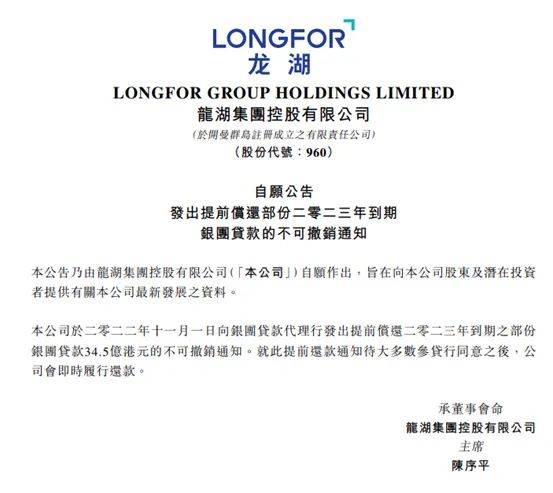 2022年11月1日,龙湖集团又在港交所公告,公司当日向银团贷款代理行发出提前偿还2023年到期的部分银团贷款34.5亿港元的不可撤销通知。就此提前还款通知待大多数参贷行同意之后,公司会即时履行还款。
